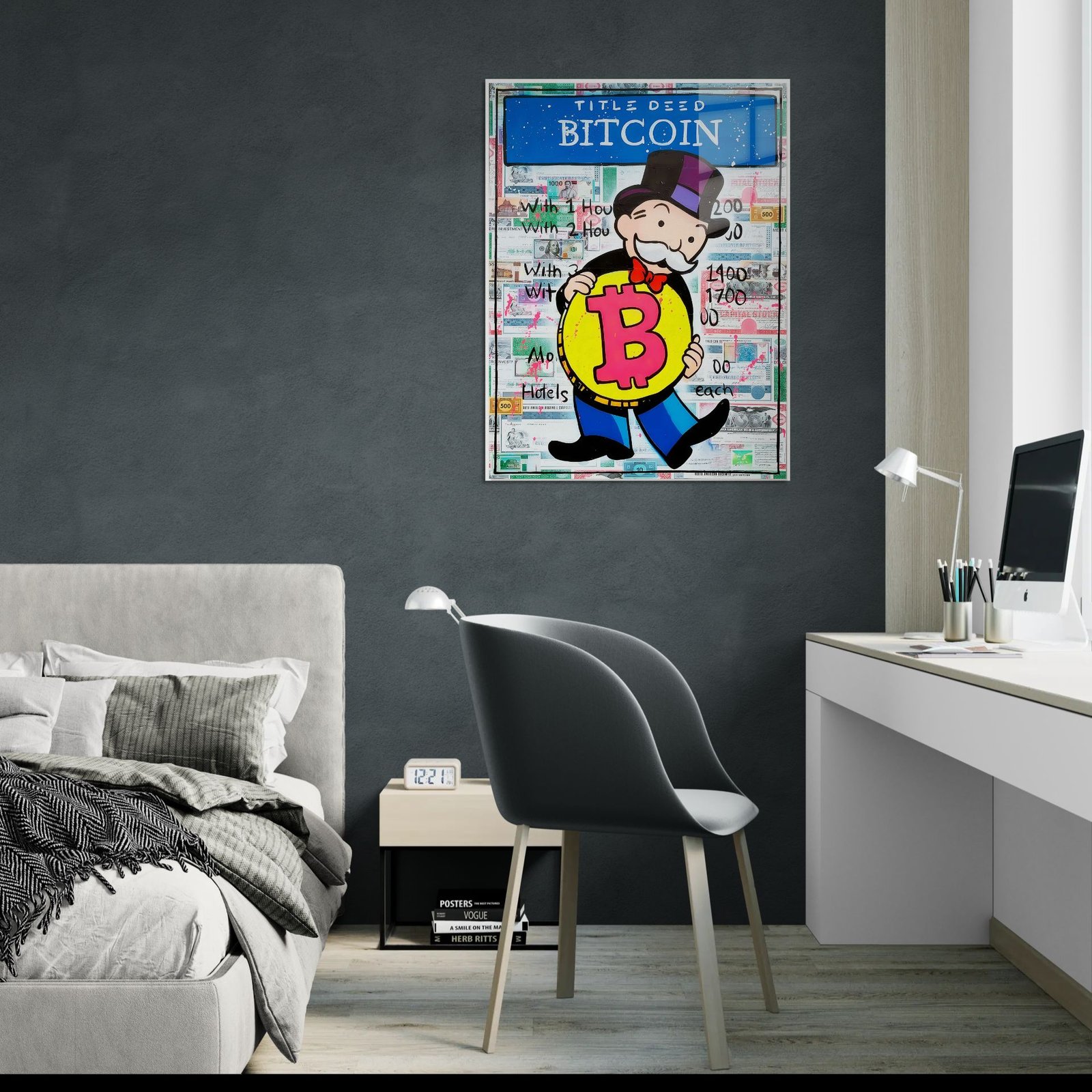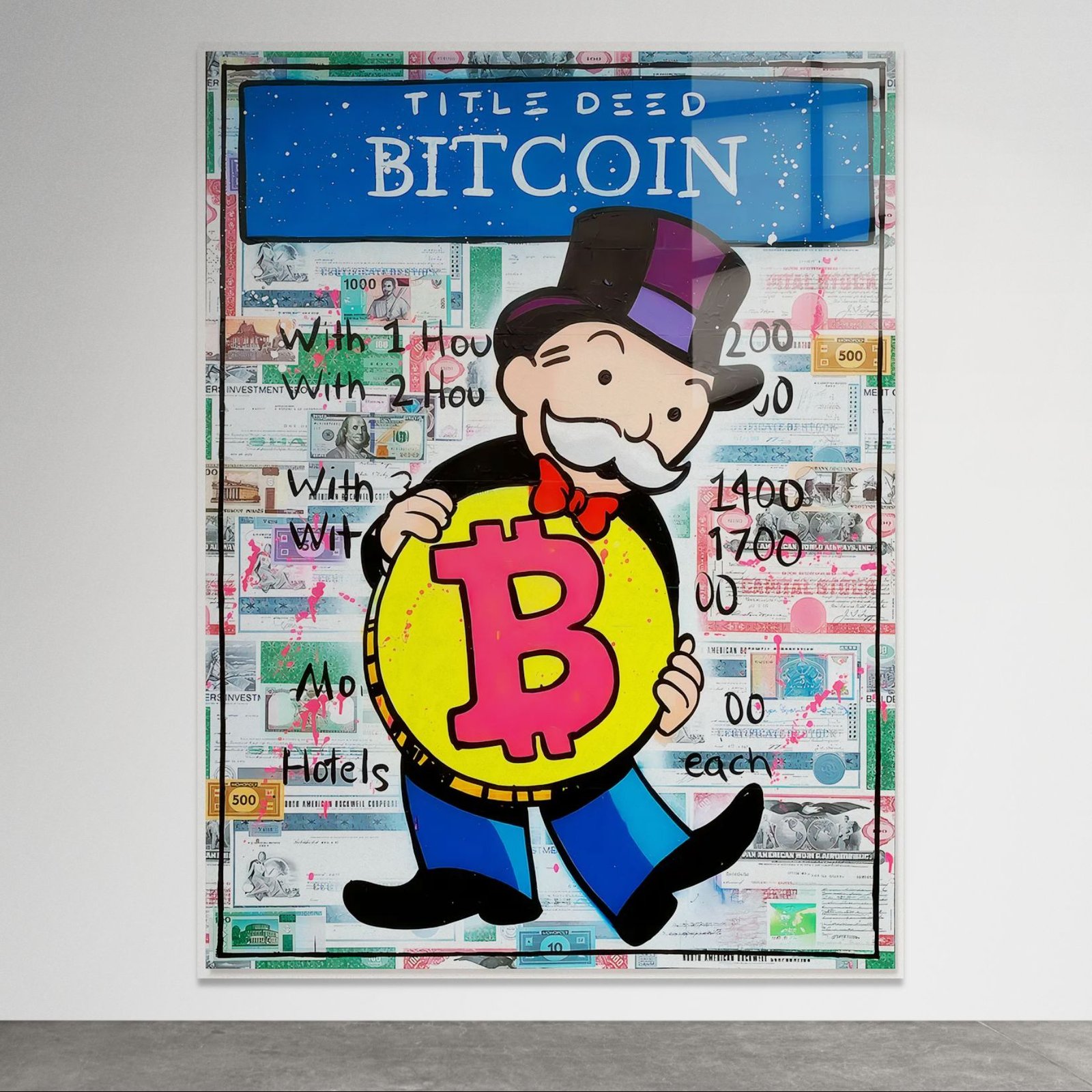 „Bitcoin Title Deed“ – ryškus pop art paveikslas ant metalo (aliuminio), sujungiantis senosios ekonomikos simbolius ir naujos eros valiutą.