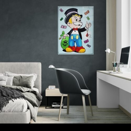 Elegantiškas milijonierius iš pop kultūros laiko „Ethereum“ pakabuką ir maišą pilną pinigų! „Crypto Gentleman“ – tai drąsus, minimalistinis pop art kūrinys, jungiantis klasikinį stilių su šiuolaikine kriptovaliutų energija. Idealiai tinka biurui ar moderniam interjerui, kuriame vertinama prabanga ir inovacijos.