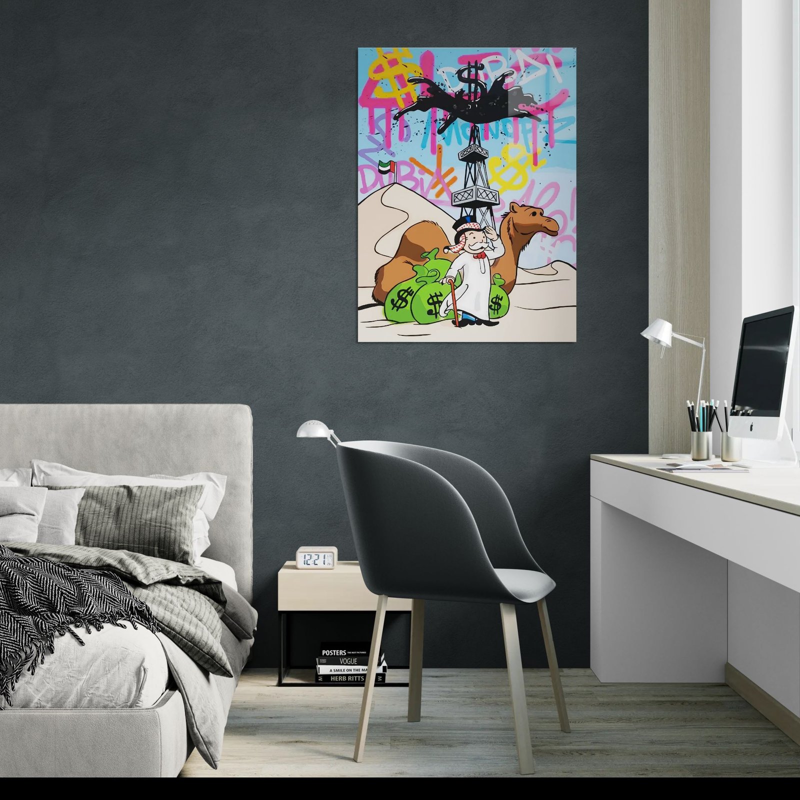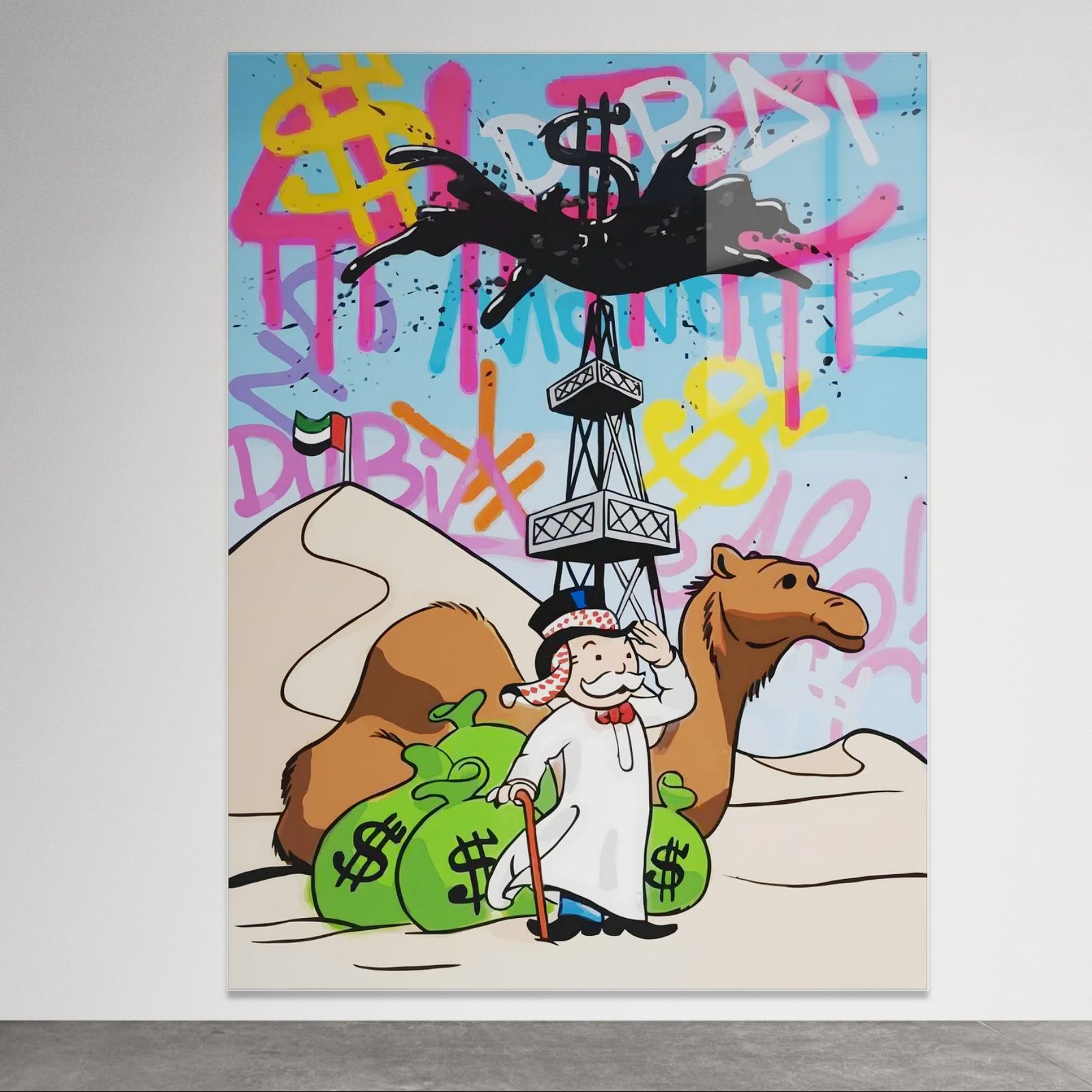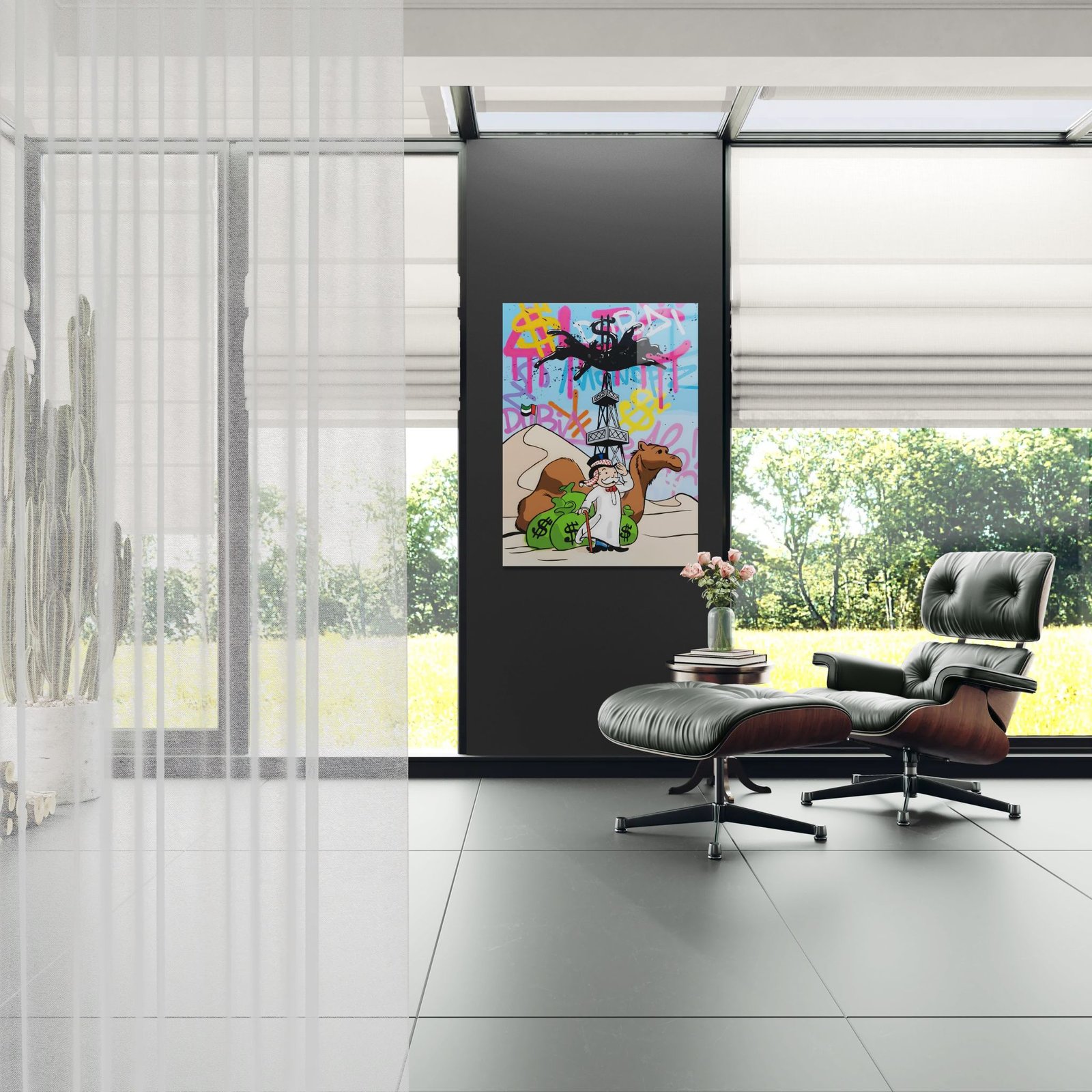 Spalvingas ir išraiškingas pop art kūrinys, vaizduojantis arabų pasaulio prabangą ir naftos simboliką. „Dubai Dreams“ perteikia sarkastišką žvilgsnį į pinigų, statuso ir galios kultą, jungdamas klasikinį „Monopoly“ personažą, kupranugarį ir naftos bokštą. Idealus akcentas moderniam biurui ar interjerui, kuriame vyrauja stipri asmenybė ir humoro jausmas. Spausdinta ant aukštos kokybės aliuminio, paviršius pasižymi subtiliu blizgesiu ir ryškiu spalvų gyliu.