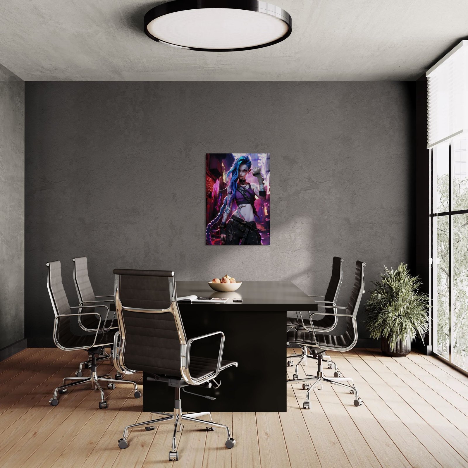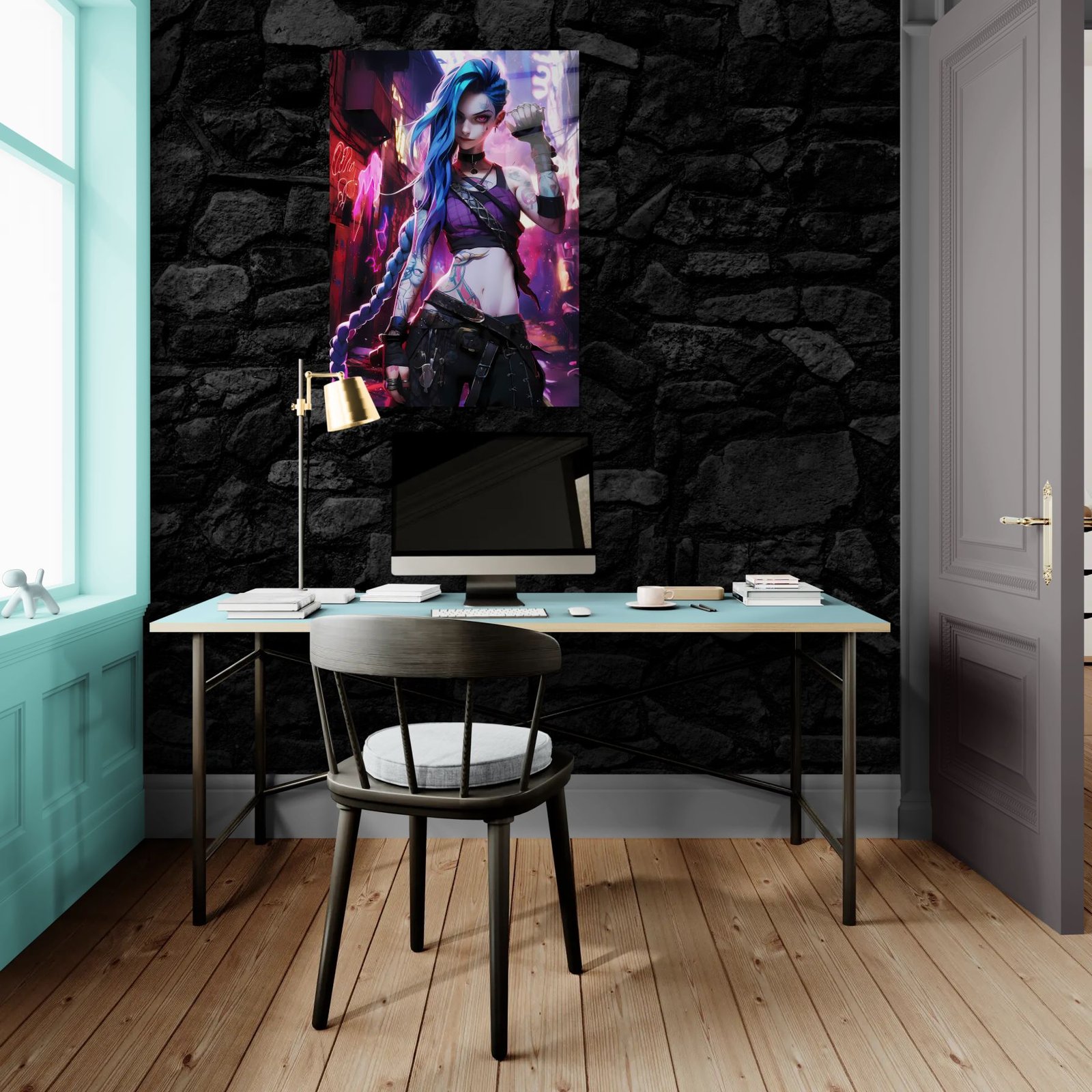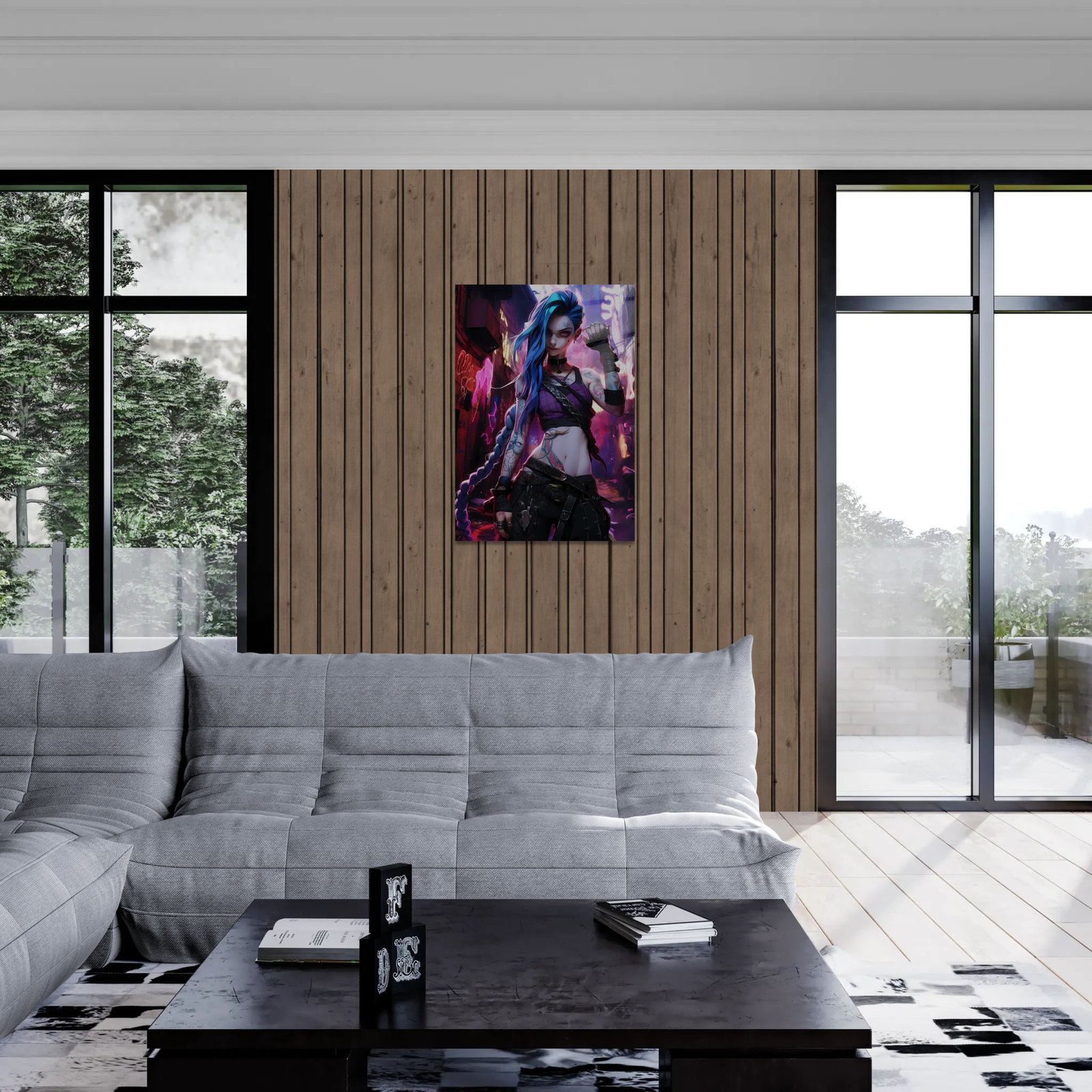 „Jinx“ – išraiškingas anime paveikslas ant aliuminio, perteikiantis beprotybės, laisvės ir energijos dvasią iš „Arcane“ pasaulio.