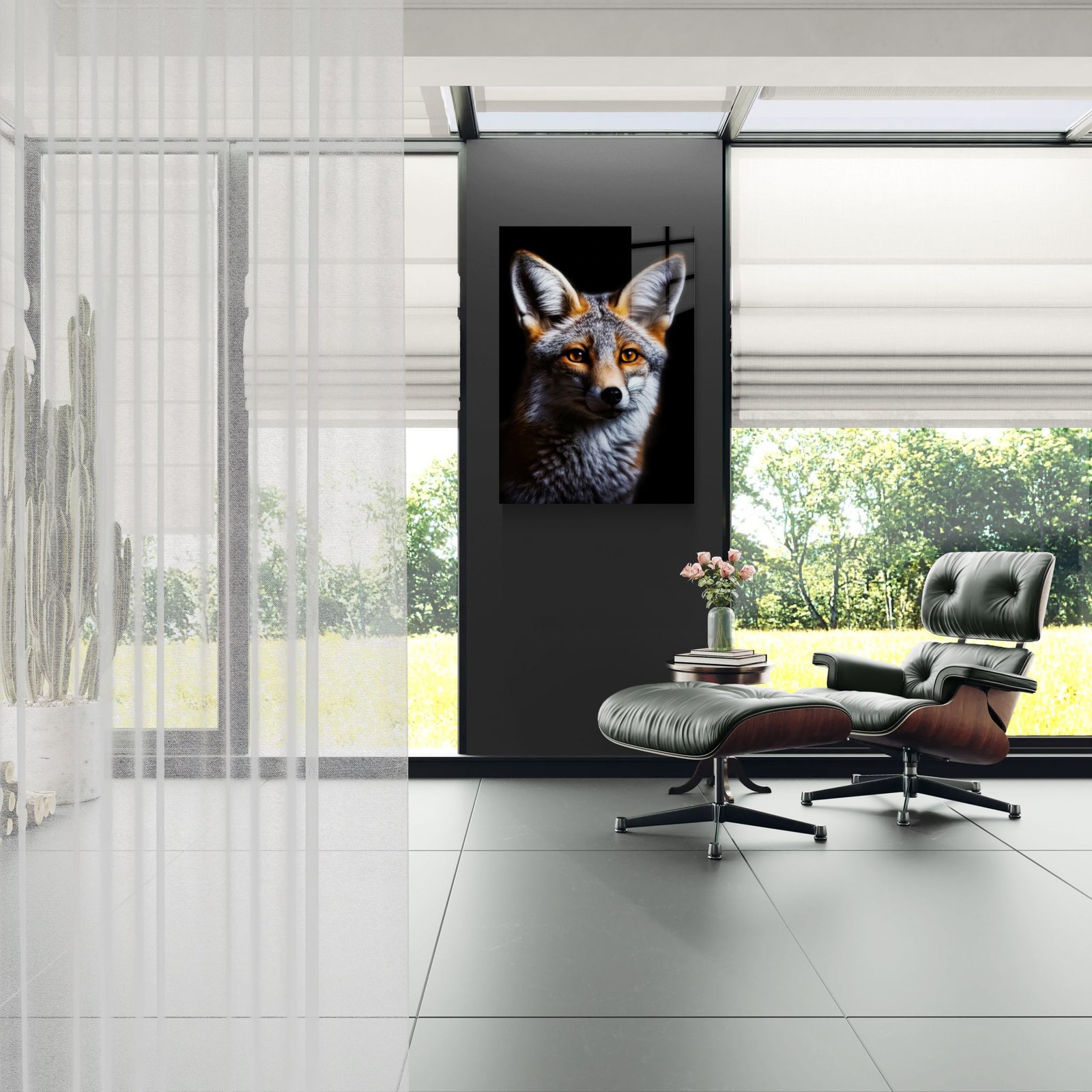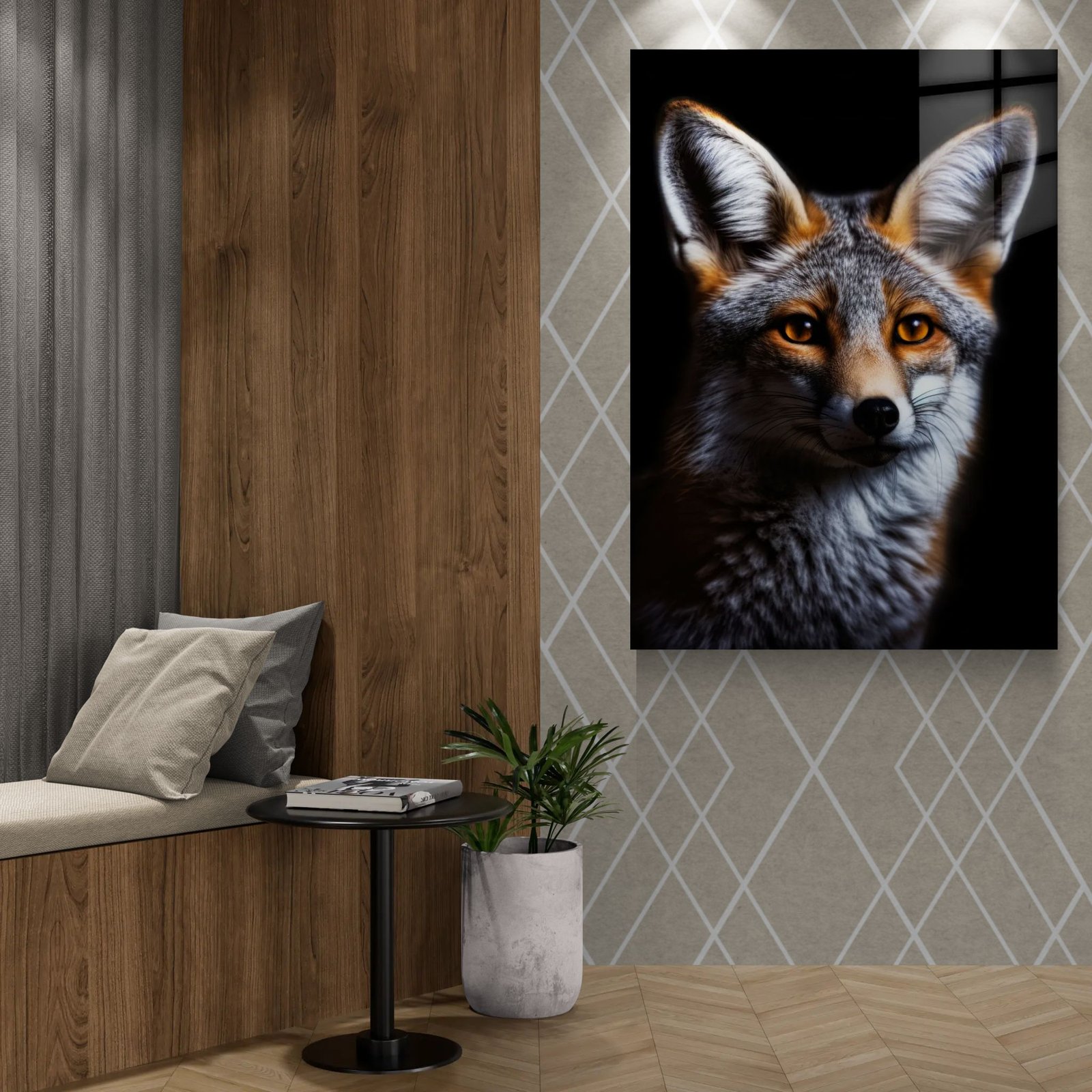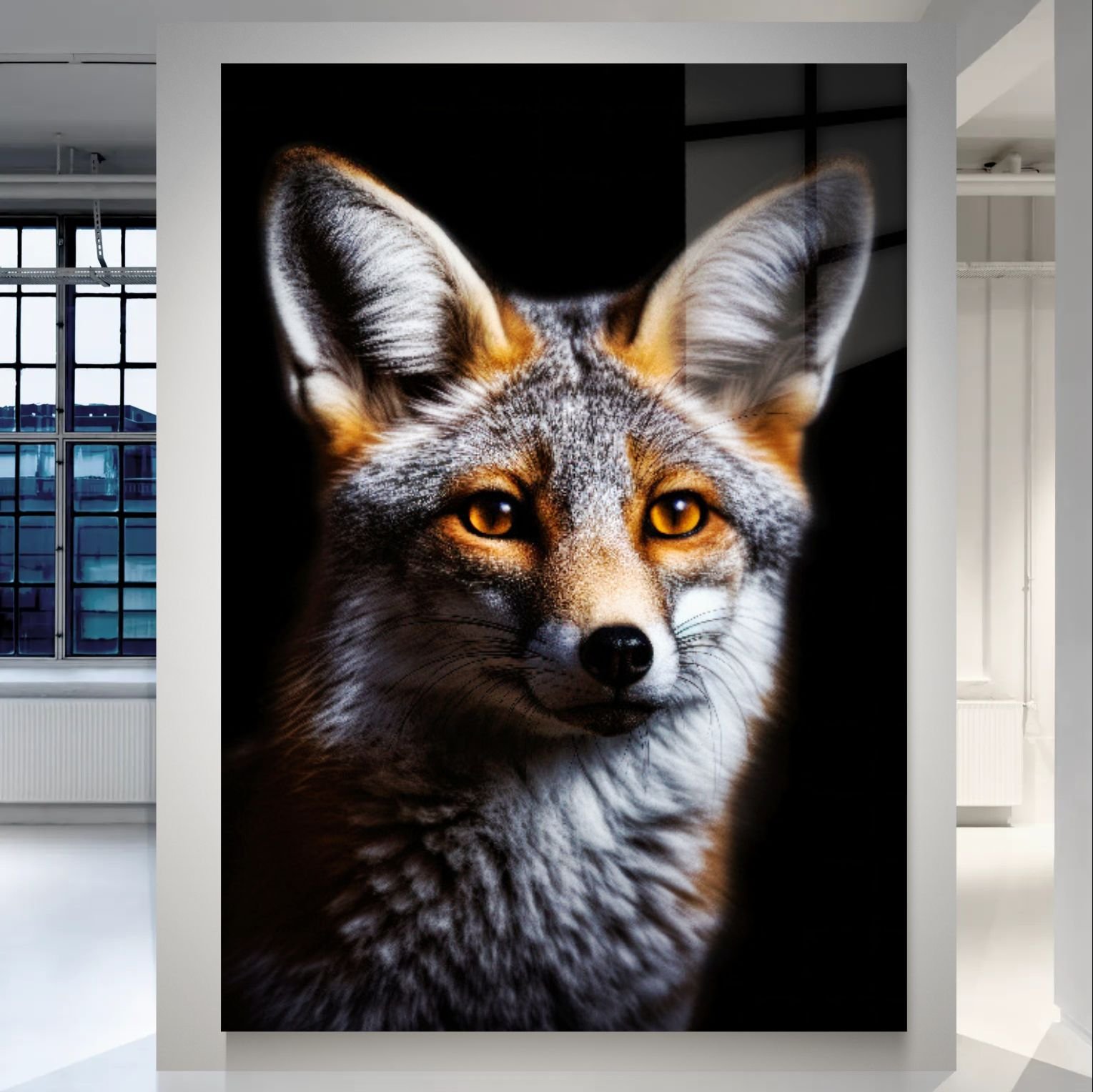 „Lapė“ – išraiškingas laukinio gyvūno portretas ant aliuminio, perteikiantis išmintį, budrumą ir natūralų grožį. Ryškios gintaro spalvos akys, detalus kailio tekstūros atkūrimas ir tamsus fonas sukuria stiprų vizualinį kontrastą bei gilų žvilgsnio efektą.