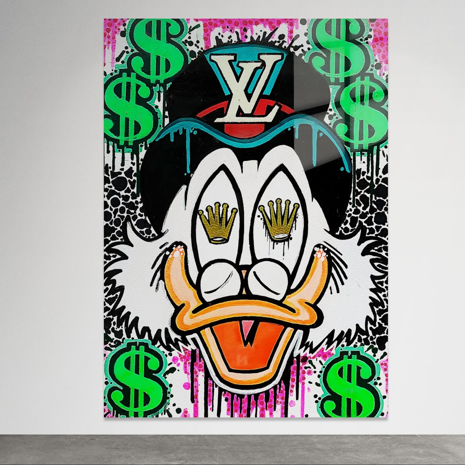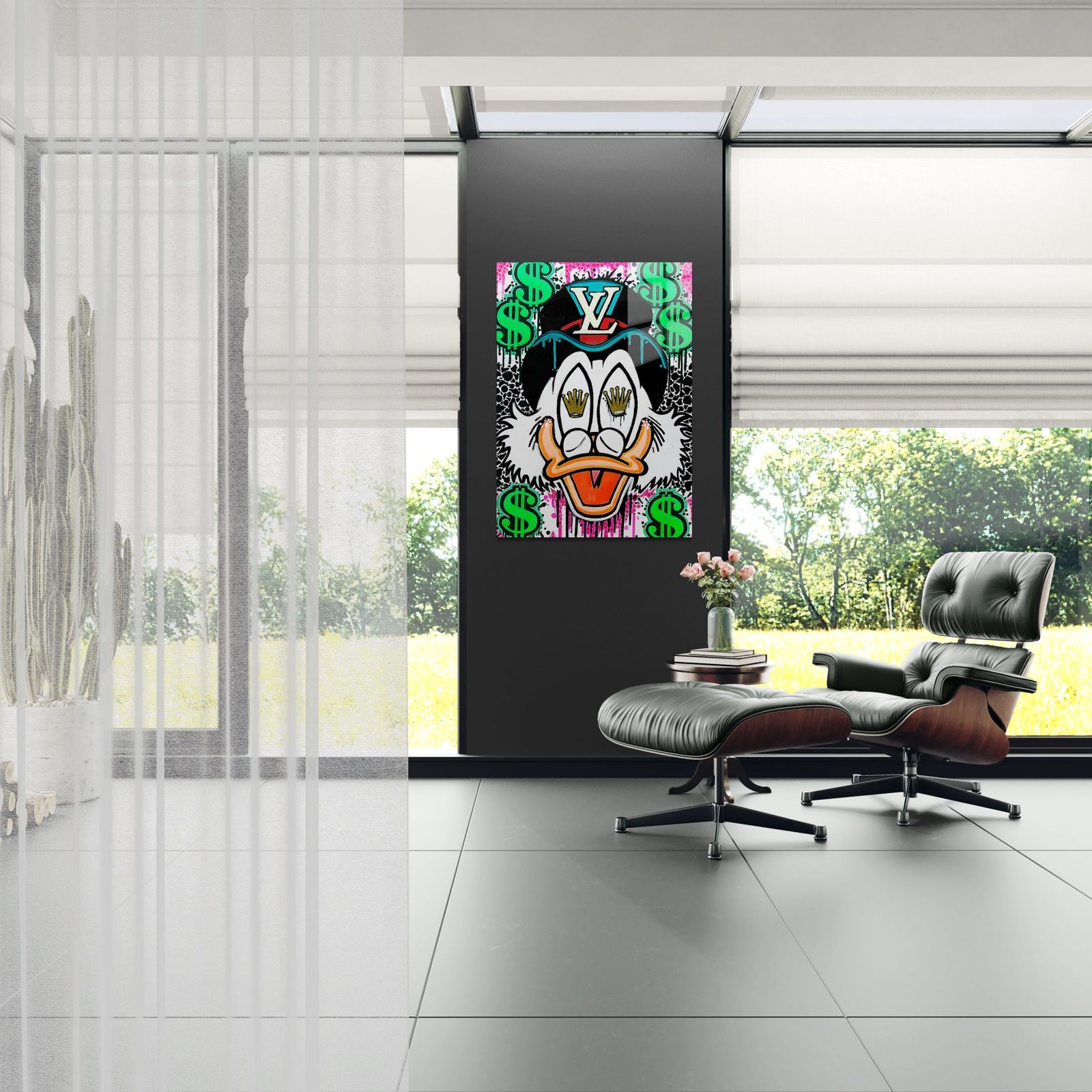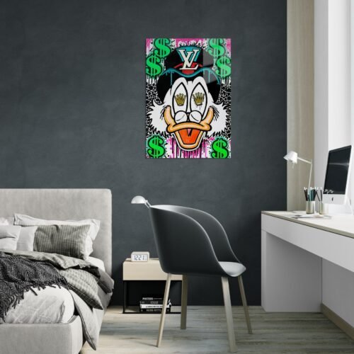 Scrooge McDuck vėl čia – šįkart su „Louis Vuitton“ cilindru ir „Rolex“ akimis! Drąsus pop art kūrinys apie prabangą, sėkmę ir žaismingą požiūrį į pinigus. Spalvų kontrastai, $ simboliai ir energinga kompozicija suteiks tavo erdvei šiuolaikinio meno charakterio ir pozityvios energijos.