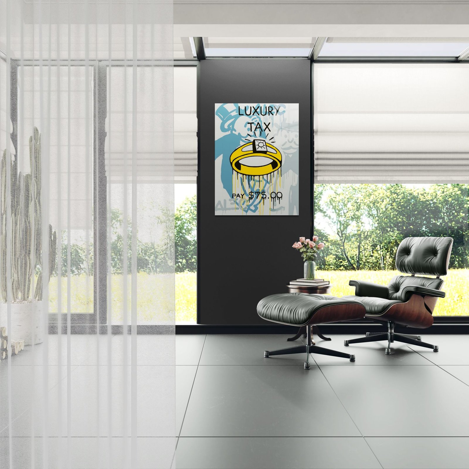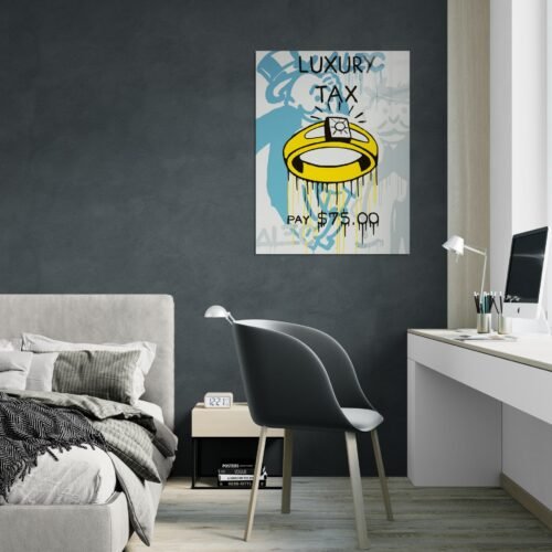 „Luxury Tax“ – provokuojantis pop art paveikslas ant metalo (aliuminio), vaizduojantis prabangos kainą šiuolaikiniame pasaulyje. Didelis aukso žiedas ir simbolinė frazė “PAY $75.00” primena, kad net prabanga turi savo mokestį.