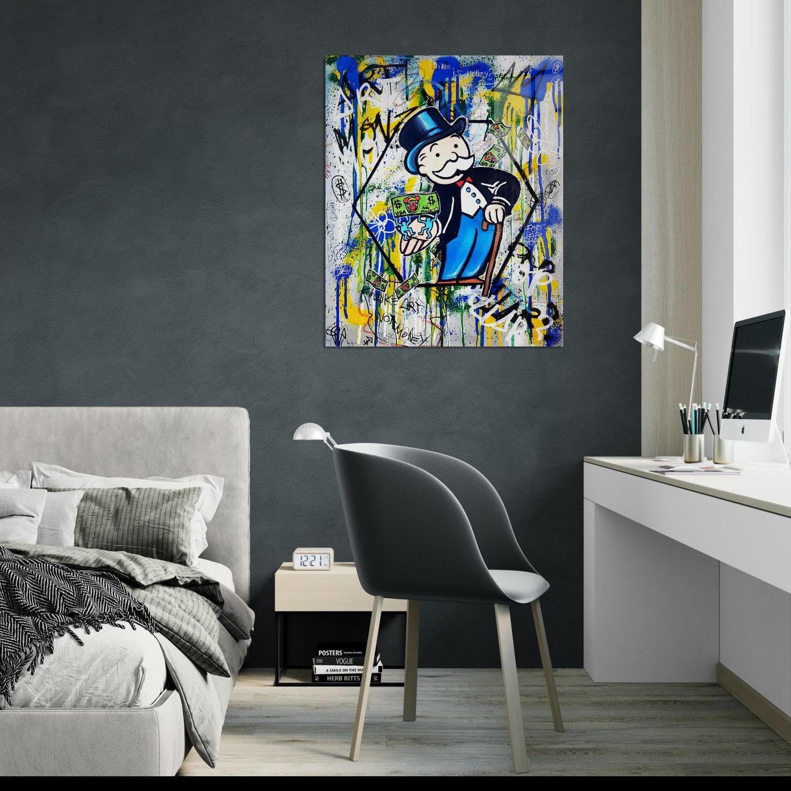 Klasikinis „Monopoly“ veikėjas čia tampa ironijos personažu – vietoje godumo, jis siūlo kūrybą. Fone – ryškūs grafičio potėpiai, lašeliai ir spalvų kontrastai, kurie suteikia kūriniui tikrą street art atmosferą.