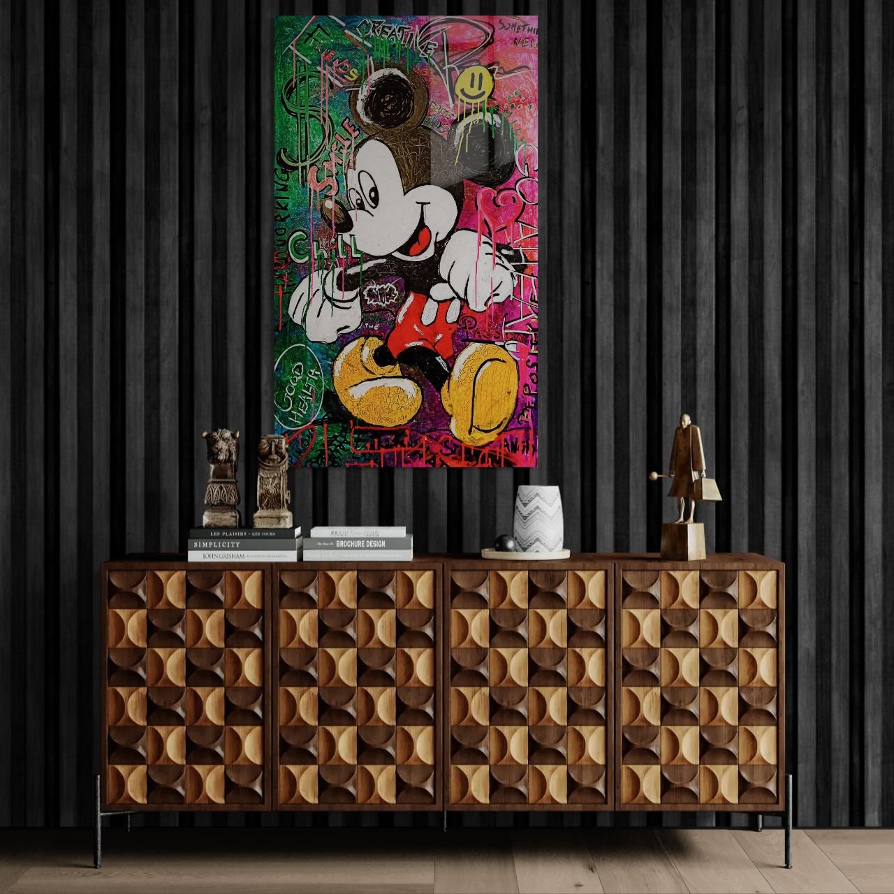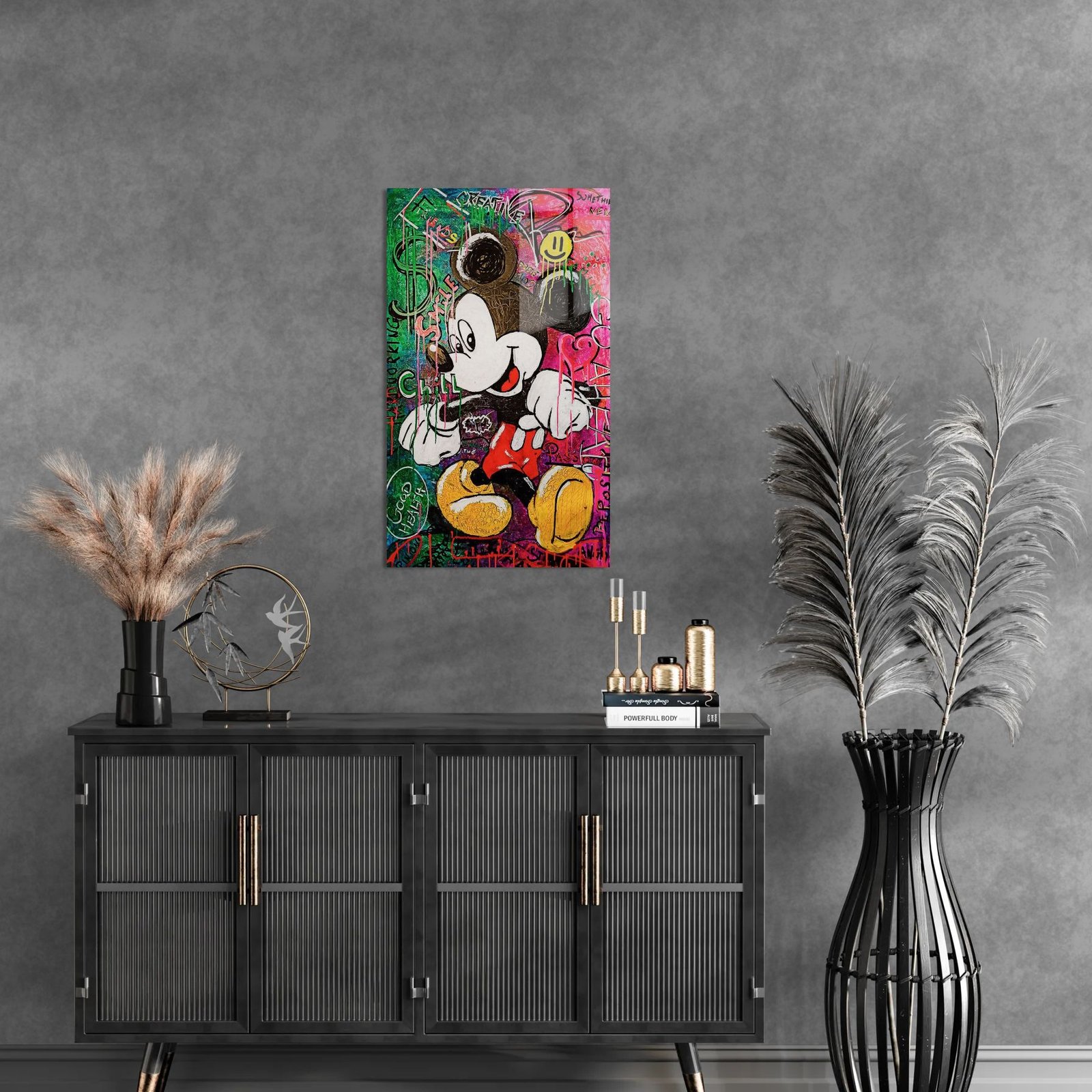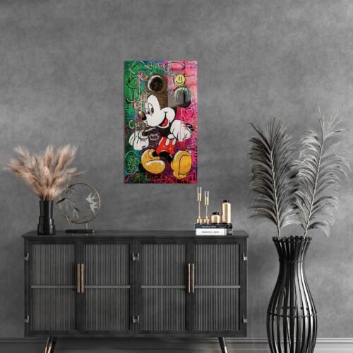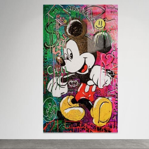 Spalvų sprogimas ir vaikystės nostalgija susilieja šiame moderniame gatvės meno įkvėptame kūrinyje. Ikoniškas Mickey Mouse čia atgimsta per urbanistinį stilių – ryškūs dažų potėpiai, grafičių užrašai ir teigiamų emocijų energija kuria džiaugsmingą atmosferą.