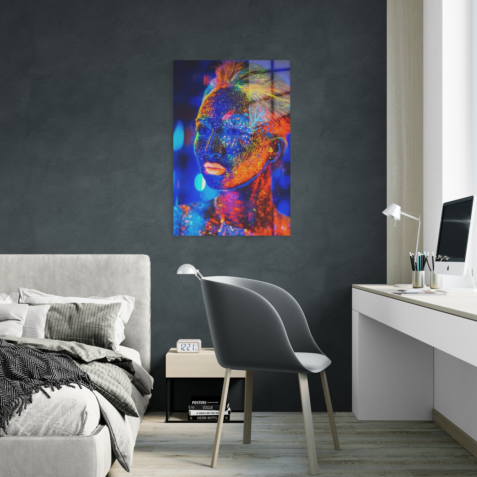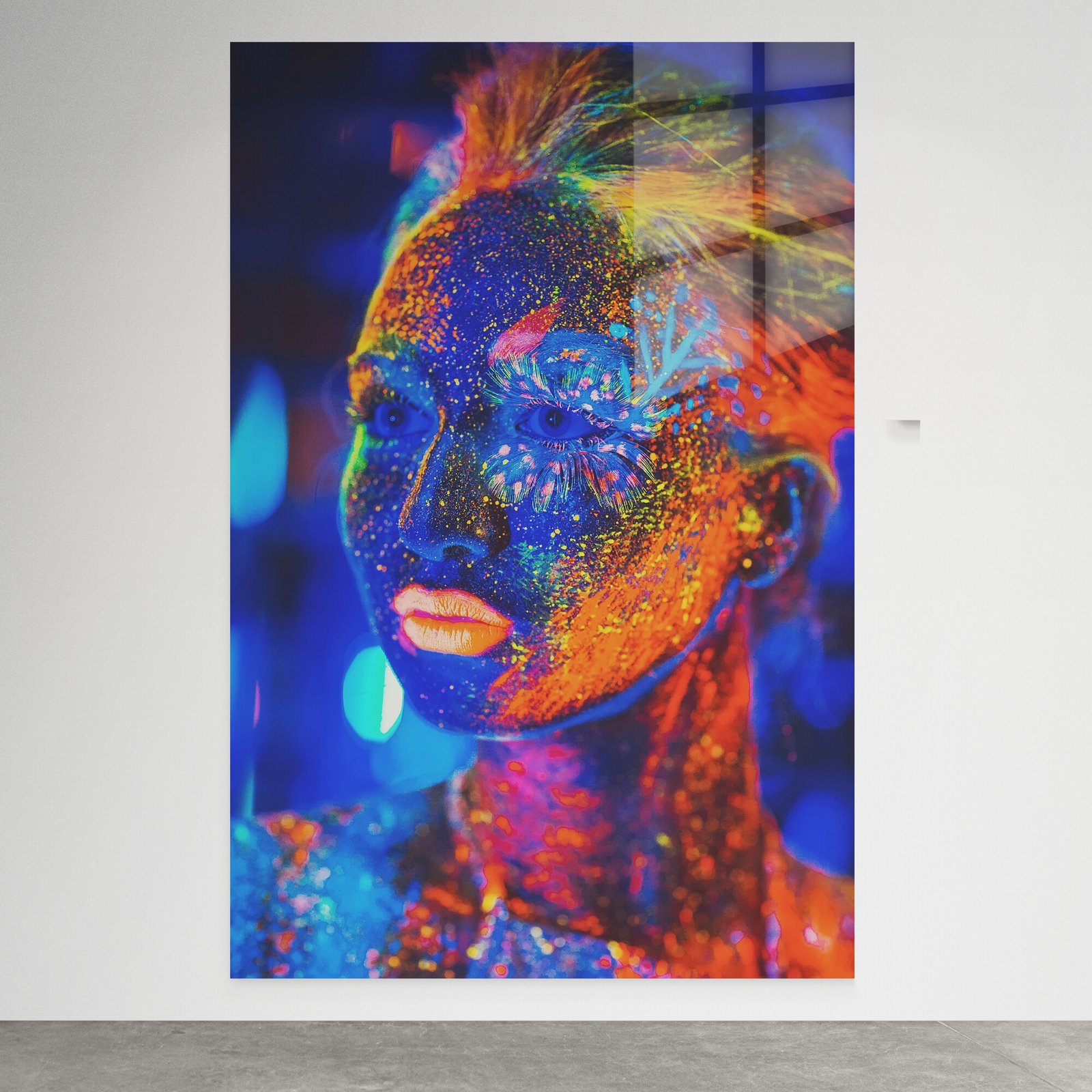Ryškus, kontrastingų spalvų portretas, atspaustas itin aukštos raiškos ant aliuminio. Paveiksle vaizduojamas žmogaus veidas, padengtas švytinčiais neoniniais tonais – mėlyna, oranžine ir rožine spalvomis. Spalvų žaismas ir metalinis paviršius sukuria gylio, šviesos ir judesio efektą. Toks kūrinys išsiskiria moderniame interjere, biure ar kūrybinėje erdvėje.