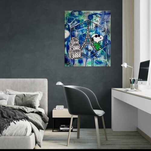 Kelionės, mados ženklai ir svajonių Paryžius viename kūrinyje! Pop art stiliaus Snoopy pozuoja prie Eifelio bokšto su Louis Vuitton lagaminais – tai žaisminga duoklė kelionių aistrai, laisvei ir stiliui. Šis spalvingas paveikslas suteiks interjerui lengvumo ir prancūziško žavesio.