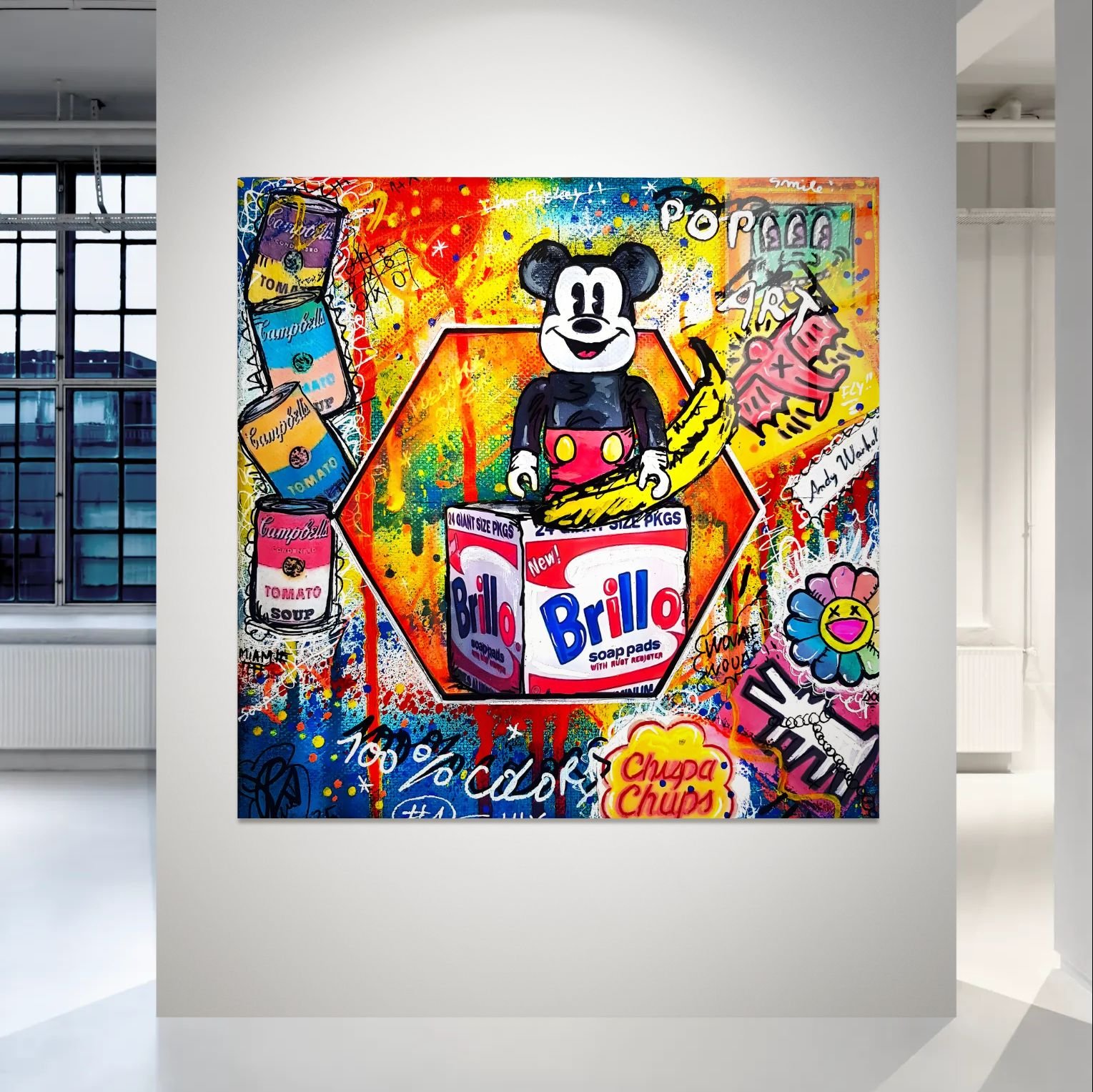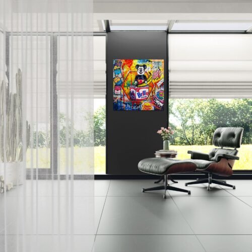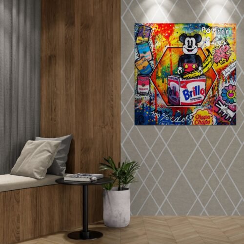 „Pop Culture Mix“ – energingas pop art paveikslas ant aliuminio, jungiantis Mickey stilių, Warhol įkvėpimą ir mados simbolius.