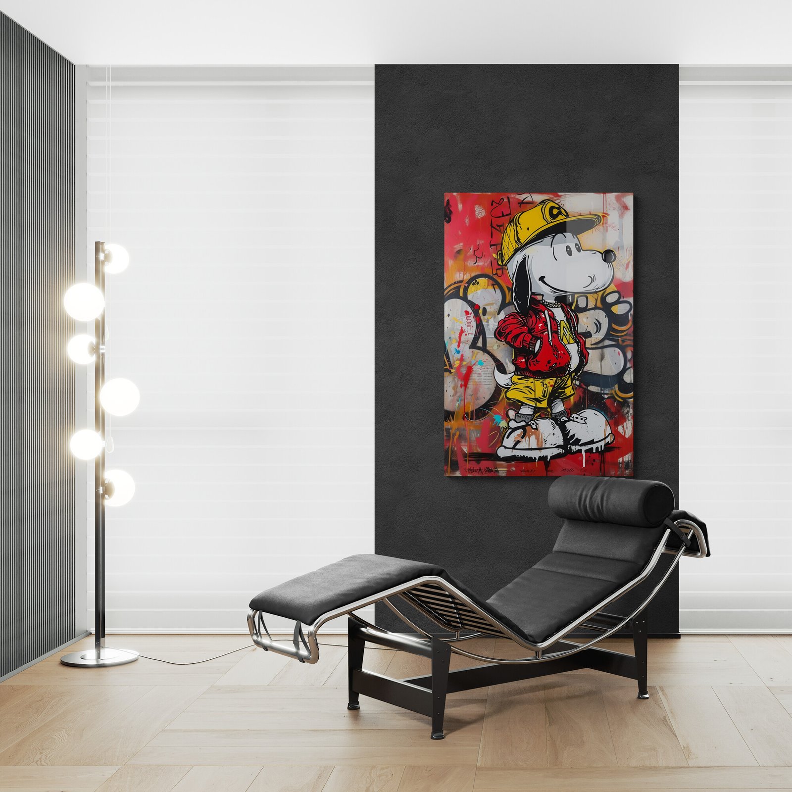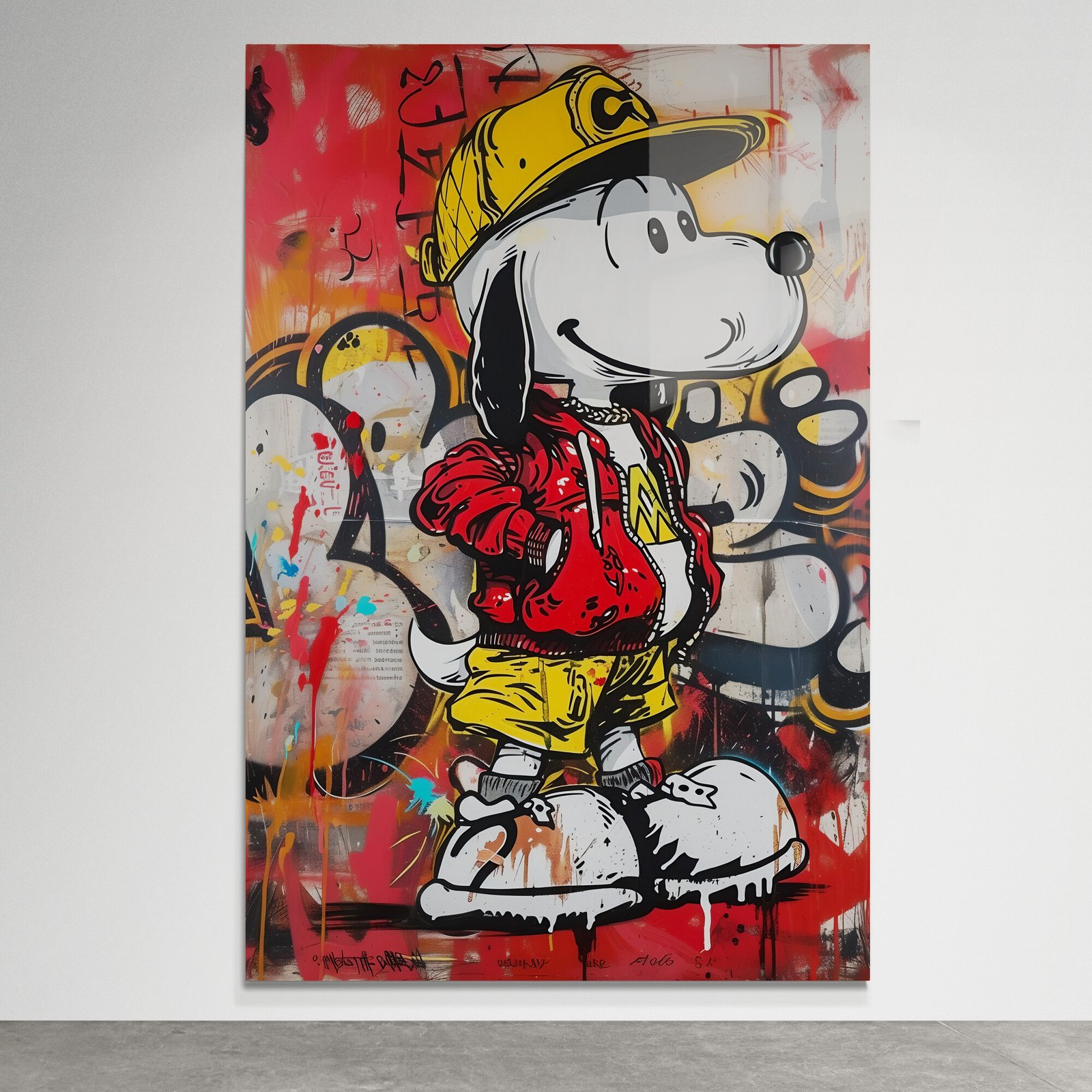 Drąsus ir žaismingas miesto herojus – šuo, vilkintis gatvės stiliaus aprangą. Ryškūs grafičio potėpiai, metalo paviršiaus atspindžiai ir energingi tonai sukuria modernų kontrastą tarp vaikystės nostalgijos ir šiuolaikinės kultūros.